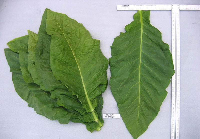 Black Mammoth is a dark tobacco that produces large, think, heavy weight leaves. The stot plants are very weather resistant. It grow to about 4' 1/2 to the flower head and produces an average of 13 to 14 leaves per plant. The leaves average 16 to 18 in width and 30 to 33 inches in length. Maturity and flower are in about 60 to 65 days,