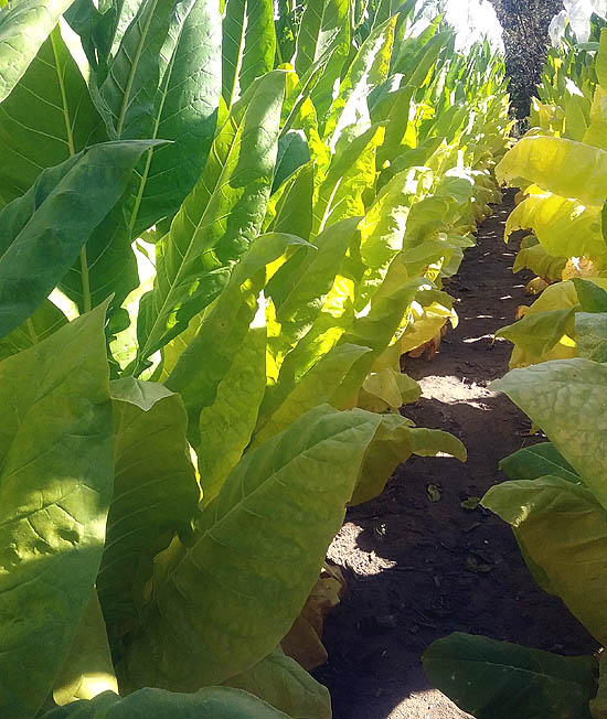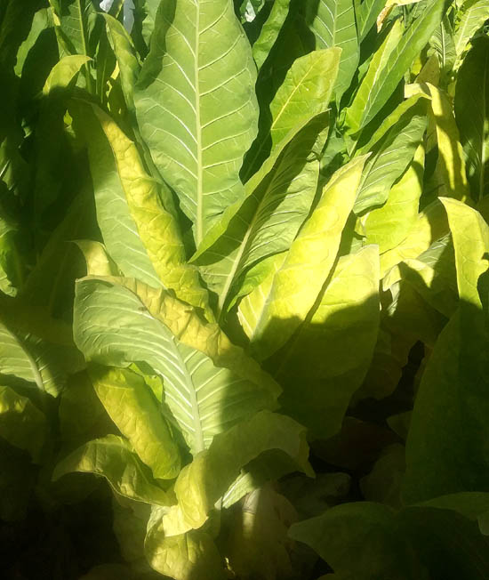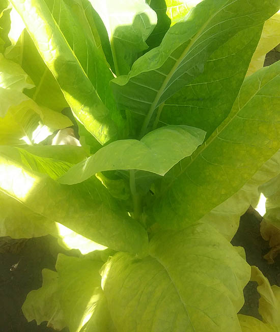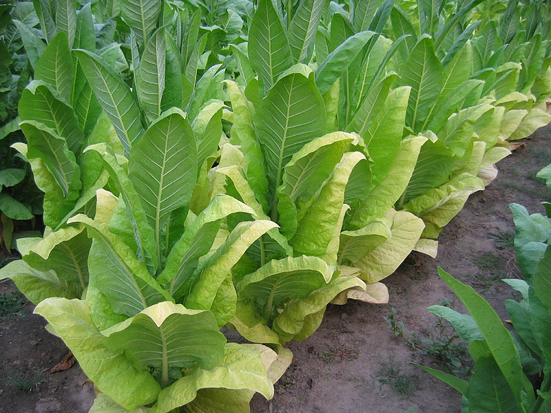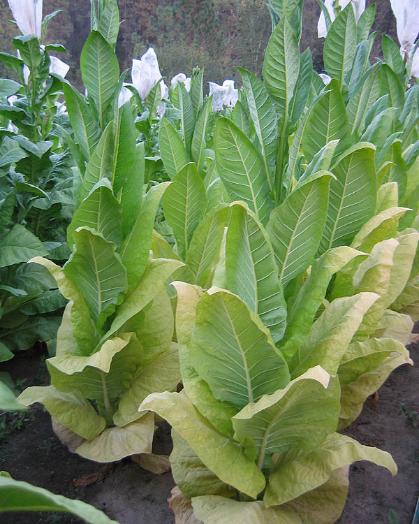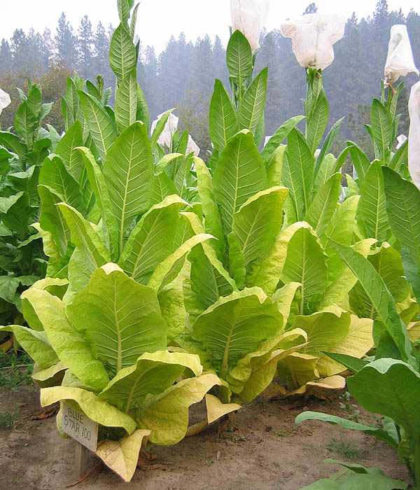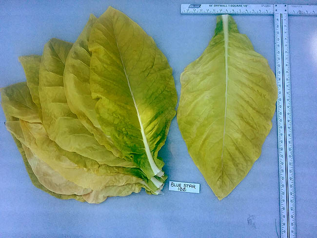 | Blue Star 100 is a Burley tobacco which grows to a height of 6' to the crows foot, or 7-8 with the flower head. The plant is columnar in shape with up turned leaves and a growth pattern similar to TN 90. The upright columnar plant form gives it good wind resistance and helps shed water easily in heavy rains. Plants produce an average of 20 to 23 leaves ranging from 24 to 30 inches in length and 15 to 16 inches in width, with good weight. Maturity is reached at approximately 77 days after transplant when 50% of the plants have at least 1 open flower. The leaves began ripening well before full maturity turning a bright lemon yellow in color and may be primed and strung as they ripen. Plants can be topped at approximately 70 days after transplant and be cut and harvested whole about 2 weeks later or when 50% or more of the leaf has yellowed up the plant. Blue Star 100 has excellent curability when primed, or when cut and hung whole to cure and dry. PI 552596