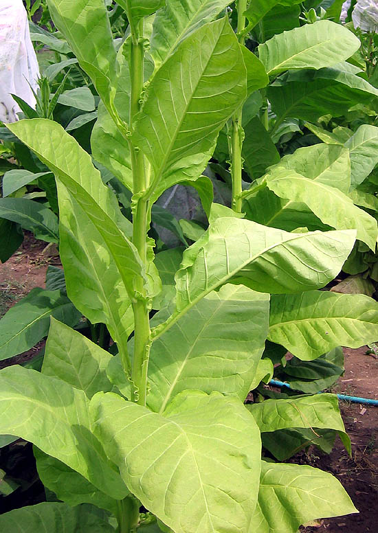 Okinawa belongs to a class of primitive tobacco, but it is a cultivar in Japan where it was developed. It grows to 7' to the flower and up to 9' in height with light green oval shaped leaves The leaves average 16" wide by 20" long. It blooms in 70-75 days with a creamy white flower. It is resistant to root nodes. The leaves air cure to a light brown.