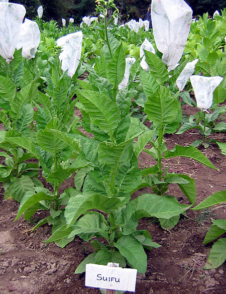 Suifu is an heirloom cigar wrapper from Japan which dates back prior to the 1930's. It grows 5' to 6' in height with leaves 12"-14" in width and 24" in length. Plants produce 18 to 20 leaves per plant with good quality. Matures in 55-60 days. Cures to a medium brown with yields of 2-3 oz and a nicotine content of 5.34%. USDA PI 405004 |
