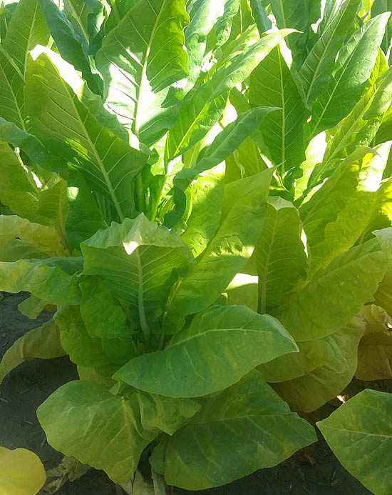 | Blue Star 100 is a Burley tobacco which grows to a height of 6' to the crows foot, or 7-8 with the flower head. The plant is columnar in shape with up turned leaves and a growth pattern similar to TN 90. The upright columnar plant form gives it good wind resistance and helps shed water easily in heavy rains. Plants produce an average of 20 to 23 leaves ranging from 24 to 30 inches in length and 15 to 16 inches in width, with good weight. Maturity is reached at approximately 77 days after transplant when 50% of the plants have at least 1 open flower. The leaves began ripening well before full maturity turning a bright lemon yellow in color and may be primed and strung as they ripen. Plants can be topped at approximately 70 days after transplant and be cut and harvested whole about 2 weeks later or when 50% or more of the leaf has yellowed up the plant. Blue Star 100 has excellent curability when primed, or when cut and hung whole to cure and dry. PI 552596
