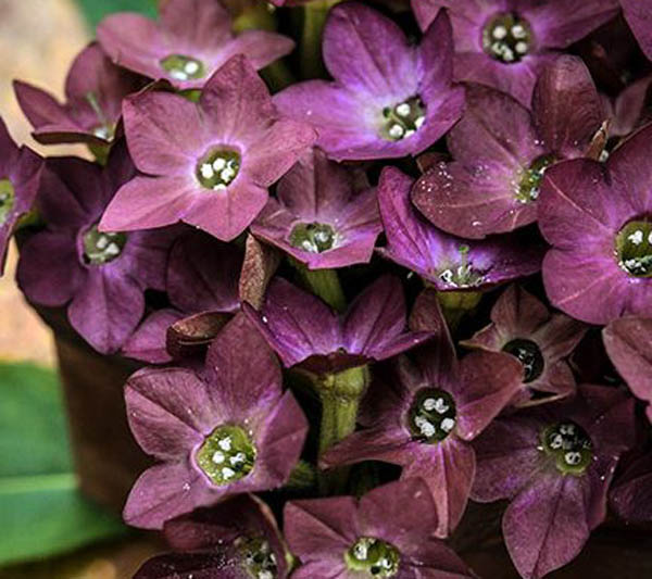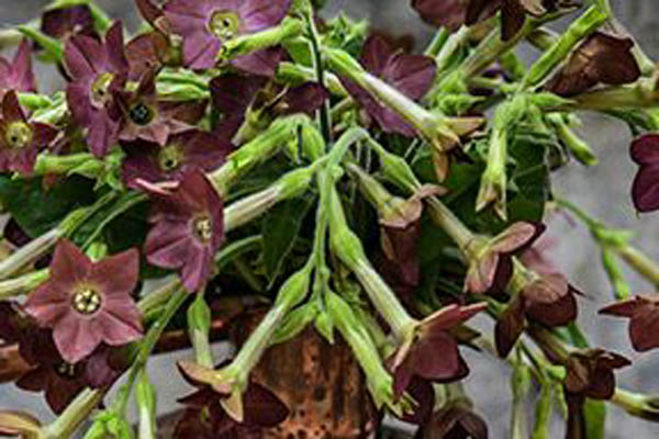 Bronze Queen is a flowering nicotiana in the Alata family. This ornamental begins blooming just few weeks after planting, and continues to grow and bloom all summer long. The trumpet shaped flowers have an unusual purple/bronzed color on the inside and a more golden bronze on the outer parts of the petals. It grows to about 3 feet in height producing many branches as it grows with more flowers on each branch. Bronze Queen is an excellent addition to the flower garden and it makes a good background plant for other flowers. |