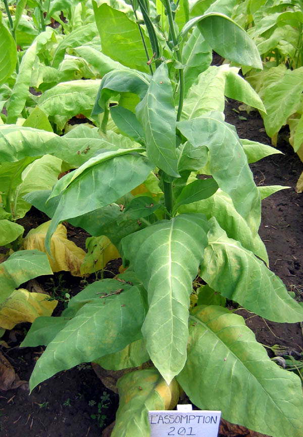 L'Assomption 201 is a cigar filler variety developed in Canada, at the L'Assomption Experimental Station during the 1930s. It is useful for as a cigar wrapper, binder and filler. The plant reaches a height of 4 1/2 to 5' at the crows foot and produces an average of 18 leaves. It reaches maturity in 50 - 55 days. It can be primed or stalk-cut or stalk-cured and air-cures easily to a deep, medium brown. PI 430516 |