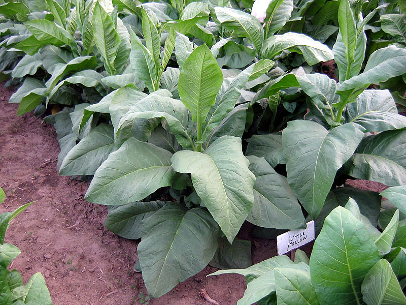 | Little Yellow is a dark air cured tobacco which is a truly unique American heirloom, dating back to before 1900. The plant produces from 16-18 leaves on a low growing plant of 4-5 feet in height, with good resistance to wind and rain. It matures early in only 50-55 days. The leaf is heavy in weight, thick and sticky, and leaves average 24-26 inches in length and 16 inches wide. The leaf cures to a reddish yellow or light golden brown. It is smooth to smoke and has a distinctive flavor and aroma. It is good choice for making chewing tobacco or using in a pipe blend. It also makes a richly flavored and smooth Cavendish. Little Yellow has a nicotine content of 3.5%. PI 551289