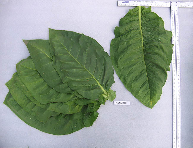 | Scantic is a a Connecticut Broadleaf cigar type wrapper tobacco developed with resistance to Fusarium wilt and reduced sensitivity to weather fleck. USDA studies showed over a 20% yield increase in comparison to the current wilt-resistant standard, regardless of whether soils were infested with the pathogen or not. Scantic grows to a height of 5 feet producing 10-12 large heavy weight leaves, The leaves range form 15-18 inches in width and 24-28 inches long. The low height of the plant makes it much more weather and wind resistant than many other wrapper strains. PI 6191633 |